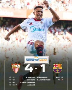 The highly anticipated La Liga clash between Sevilla and Barcelona at the Ramón Sánchez-Pizjuán turned out to be one of the most dramatic games of the season, filled with intensity, goals, and moments that showed the sharp difference in form between both sides. The match ended in a 4-1 victory for Sevilla, a result that shocked many fans but also reflected the determination and clinical finishing of the home team compared to Barcelona’s struggles on the road.